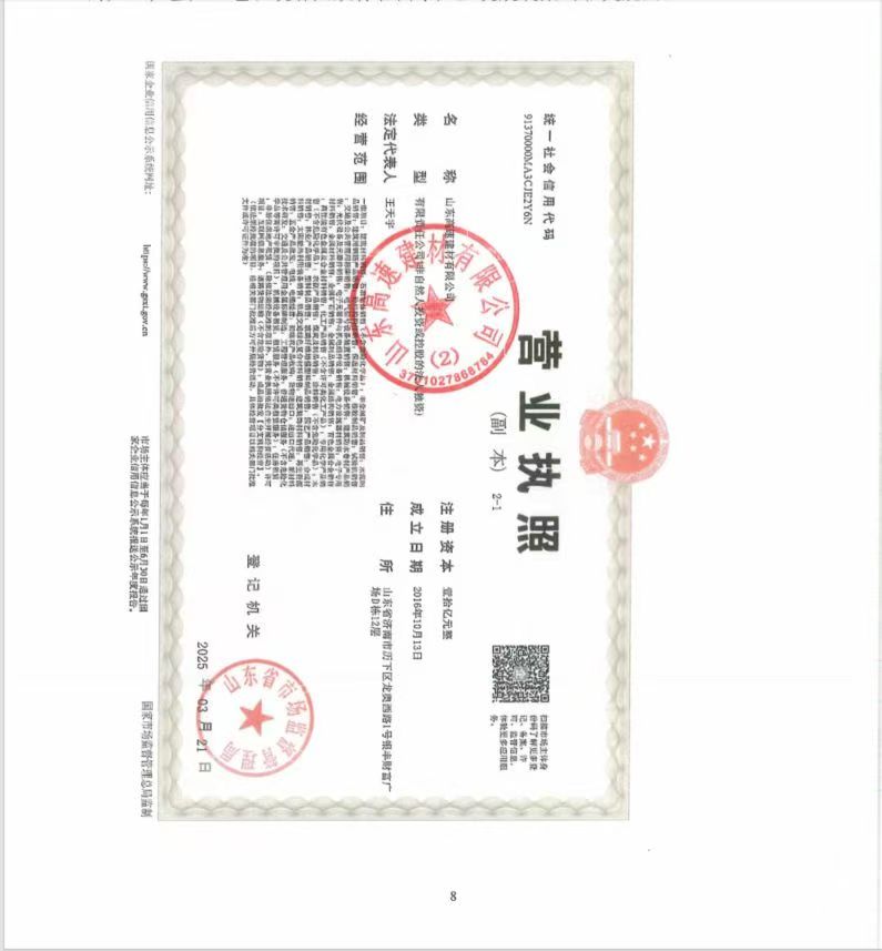山东高速建材有限公司注册资本10亿元,是山东高速新材料集团全资子公司。公司现 有钢材事业部、水泥事业部、新产品事业部、招标采购部、党群人资部、财务审计部、安全 管理部、综合办公室等8个部室、1个西南分公司,下辖山东高速交通工程有限公司、山东 高速环保建材有限公司、山东高速日照新材料有限公司等3家子公司。